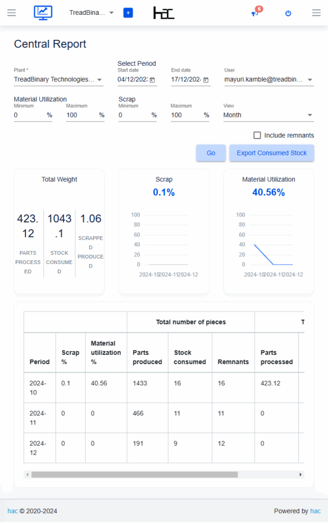 Central Report consolidates everything in one place—total weight, processed parts, stock consumed, and scrap produced—making data analysis seamless and efficient.